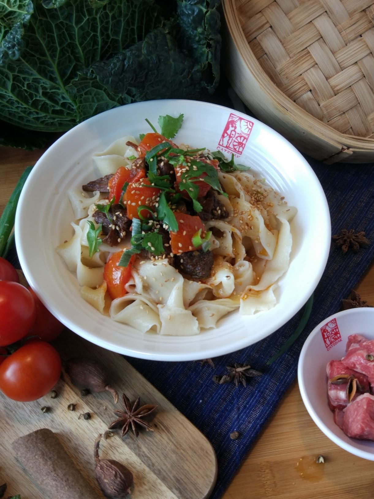 Handmade biangbiang noodles with tomato beef sauce, fried pork sauce and hot oil